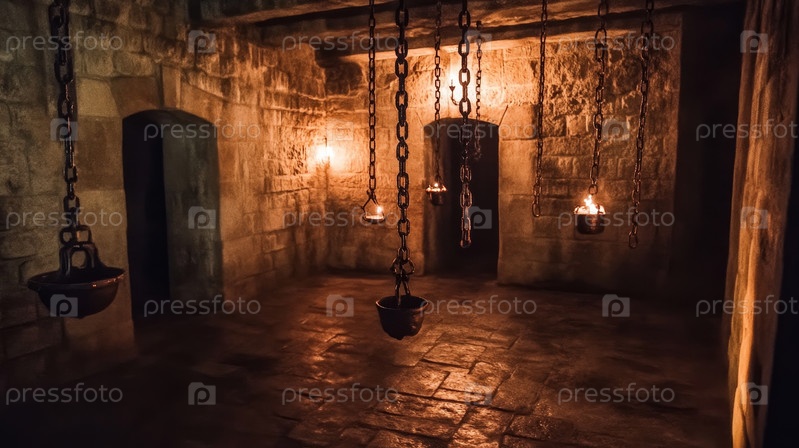 Тускло освещенная средневековая подземелья с жуткой атмосферой, каменными стенами, потолком и полом, освещенная мерцающими огненными факелами