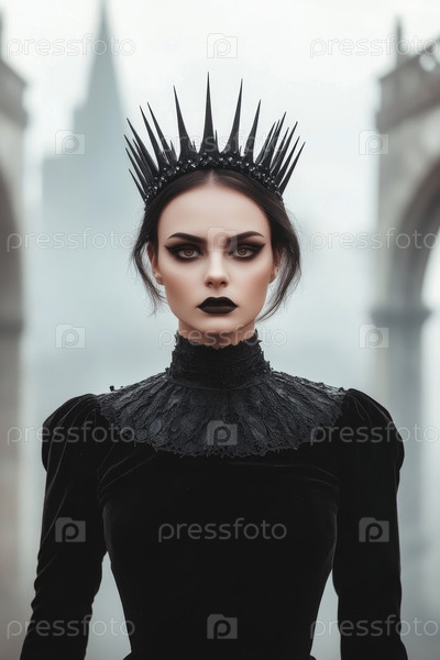 Величественная королева стоит в готической элегантности, одетая в потрясающую шипованную корону, которая излучает эфирную красоту и величие