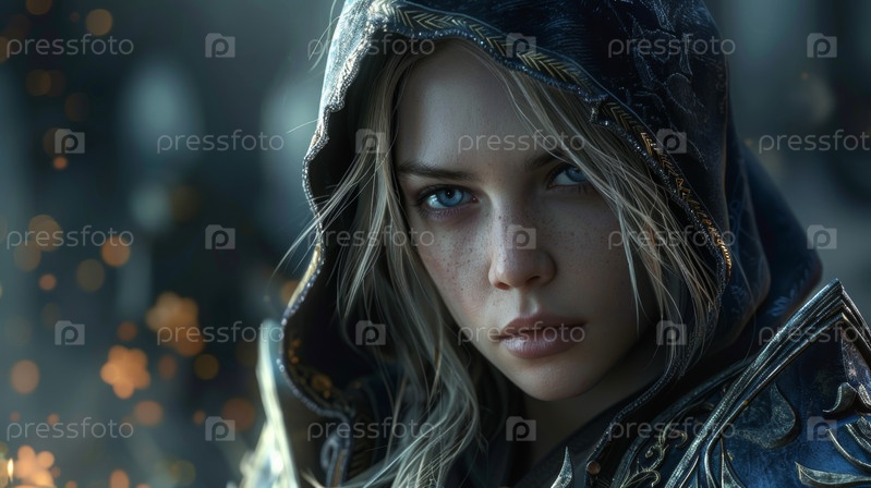 Свирепый и тяжело бронированный воин доблестно стоит на заснеженной местности, умело владея мечом
