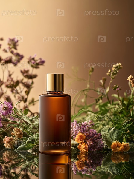 Роскошная парфюмерная бутылка элегантно отображается с ароматными травами и нежными цветами, чтобы усилить ее очарование