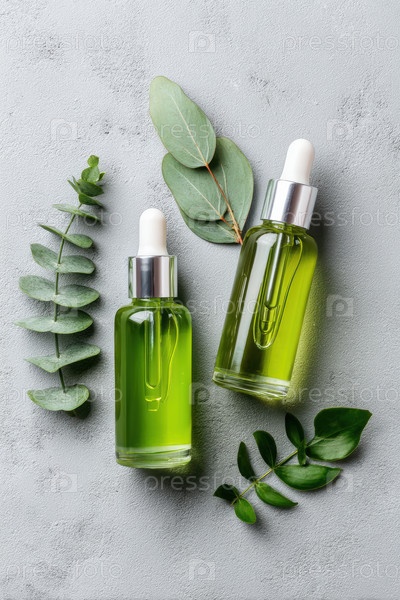 Зеленые сывороточные бутылки с листьями эвкалипта, стеклянные капельницы, опирающиеся на текстурированный серый фон, натуральное ботаническое масло для минималистской эстетики спа, свежие росистые