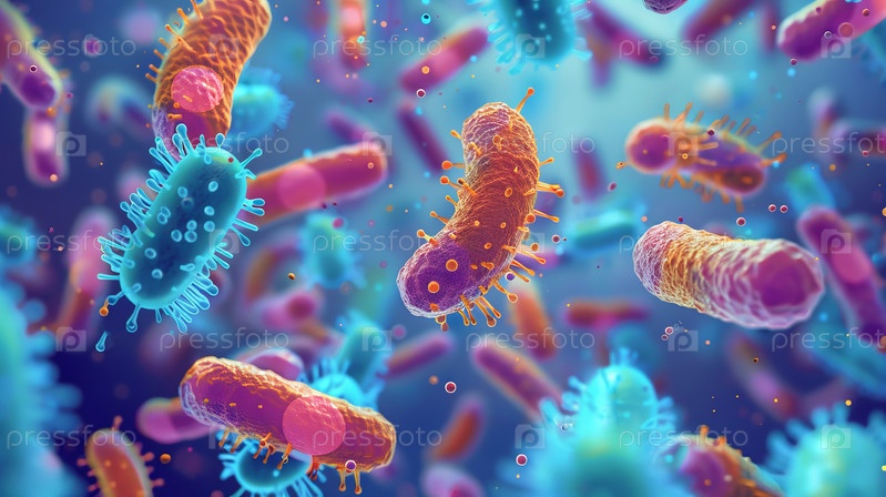 Сложные детали различных типов бактерий представлены на красочном, жидком фоне