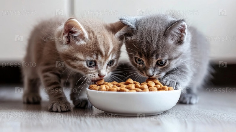 В яркой и современной кухне два пушистых котята счастливо едят вместе из голубой чаши, наслаждаясь едой