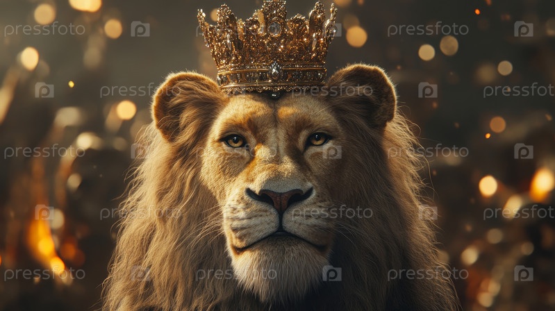 Королевский лев носит корону, окруженную мерцающими золотыми огнями боке, символизирующими силу и королевское достоинство