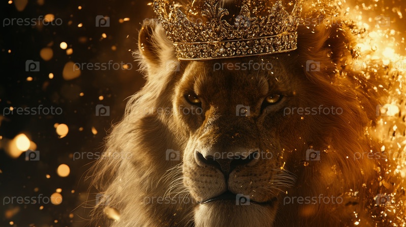 Королевский лев носит корону, окруженную мерцающими золотыми огнями боке, символизирующими силу и королевское достоинство