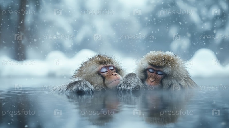 Две пушистые обезьяны отдыхают в горячем источнике, когда вокруг них падает снег, создавая безмятежную зимнюю атмосферу