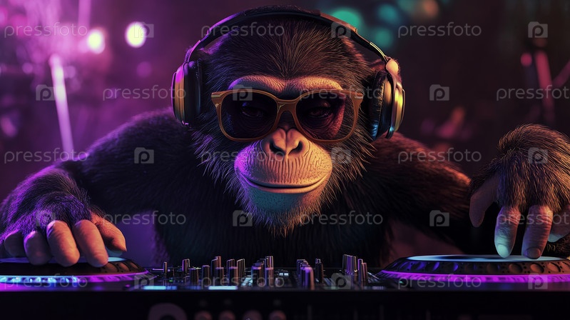 Модные обезьяны-диджеи, надевающие гладкие солнцезащитные очки, полностью погружаются в яркую сцену ночной жизни, смешивая музыку