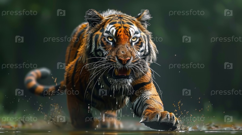 Мощный тигр заряжается через воду, демонстрируя свою силу и красоту в ярком зеленом лесу