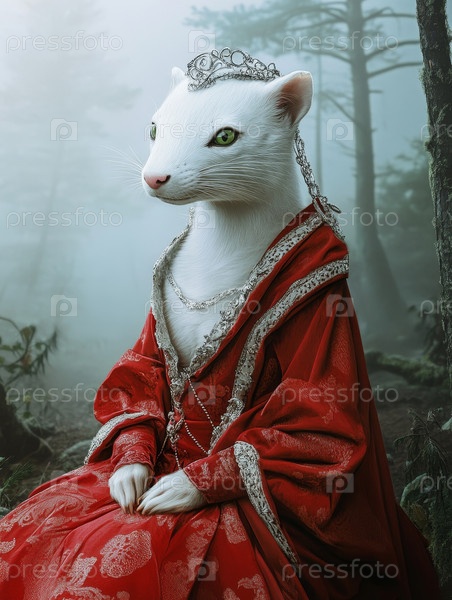 Красивая белая кошка, одетая в элегантное королевское платье, окруженная потрясающей и мистической лесной средой
