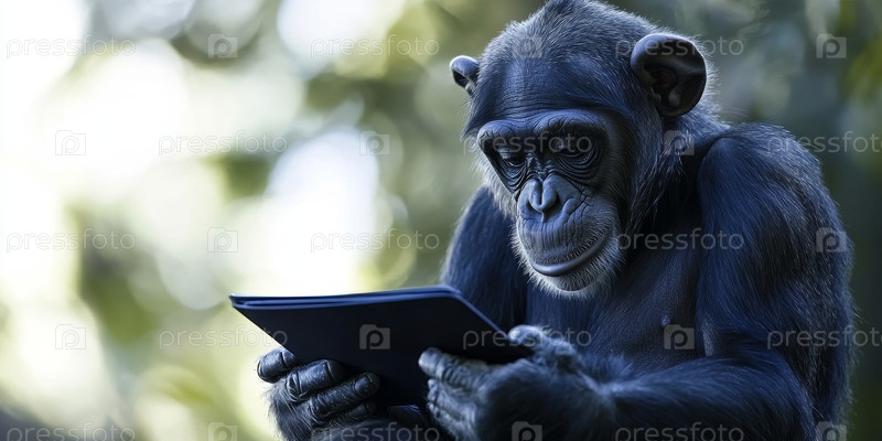 Любопытный шимпанзе активно работает с планшетом, находясь в естественной среде на открытом воздухе