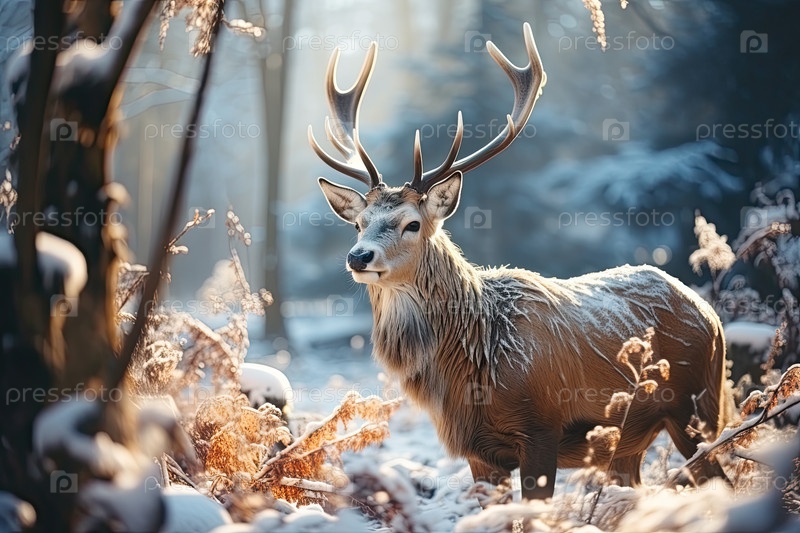 Красочный дикий олень в лесу, зимний солнечный свет