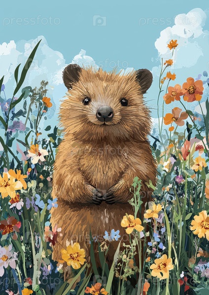 Радостная кокка, стоящая среди красочных цветов и ярко-голубого неба, олицетворяющая счастье и красоту природы