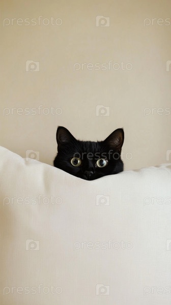 Игривая черная кошка с широкими пытливыми глазами смотрит на плюшевую белую поверхность на темном фоне