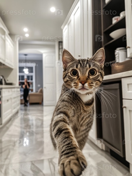 Живой кот радостно прыгает в стильной кухонной обстановке, захватывая игривый дух и домашний шарм