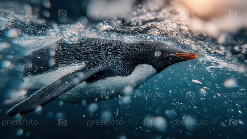 Пингвин, плавающий под водой сквозь пузырьки, яркая голубая вода, динамичное движение и острый зрительный контакт, гладкое черно-белое оперение, мерцающее светом,