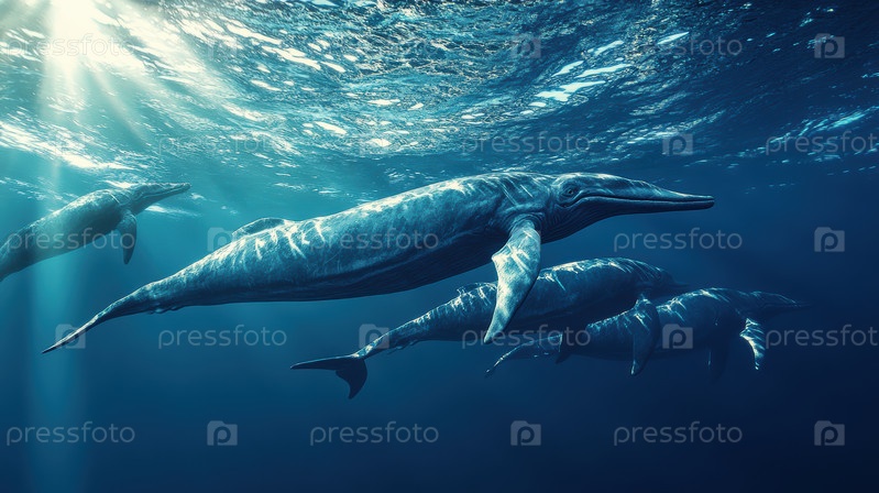 Океаническое морское зрелище, величественные киты мирно скользят по мерцающим голубым океанским водам, Спокойная миграция усатых китов под сияющими лучами через обширное открытое море