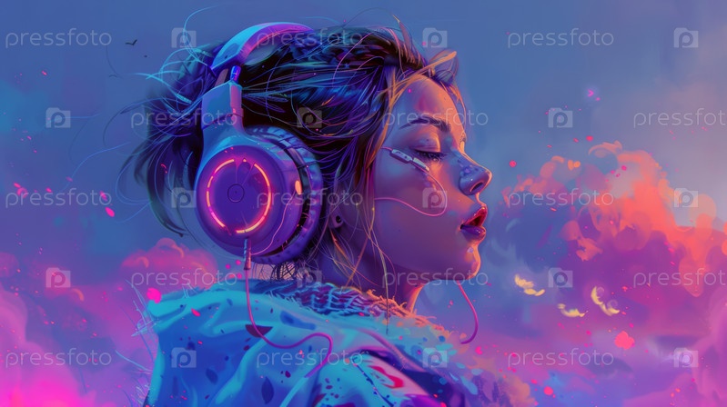 Молодая женщина с наушниками в неоне, закрытыми глазами, фото профиля, яркими розовыми и синими облаками, сверкающими частицами, расслабленным выражением, окружающим электронным настроением,