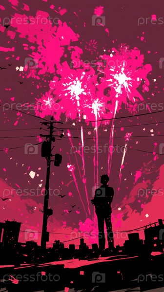 Силуэт индивидуального фотографирования праздничных городских огней ночью, Одинокий фотограф на здании запечатлел красочные фейерверки, освещающие городской горизонт во время празднования
