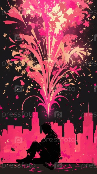 Силуэт на крыше, наблюдающий, как розовые фейерверки взрываются над горизонтом города, коммунальный столб и провода, прорезанные на переднем плане, постеризованная неоновая палитра пурпура,