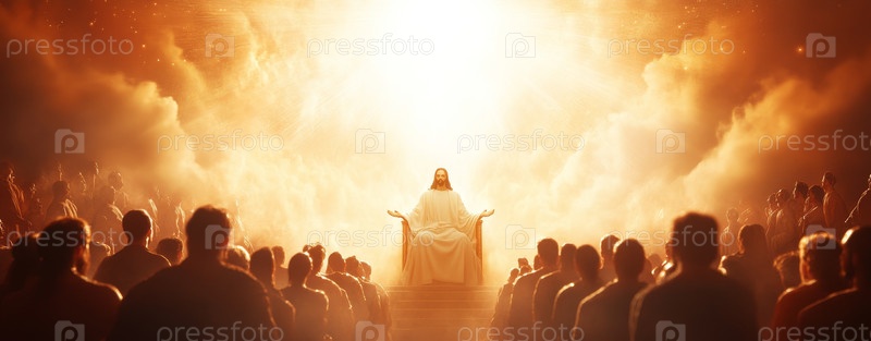 Иисус сидит на небесном престоле и приветствует своих последователей. Второе пришествие Иисуса Христа. Библейская сцена. Концепция христианской религии, яркий оптимистический фон