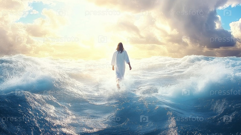 Духовная фигура, идущая по воде среди огромного и бурного моря