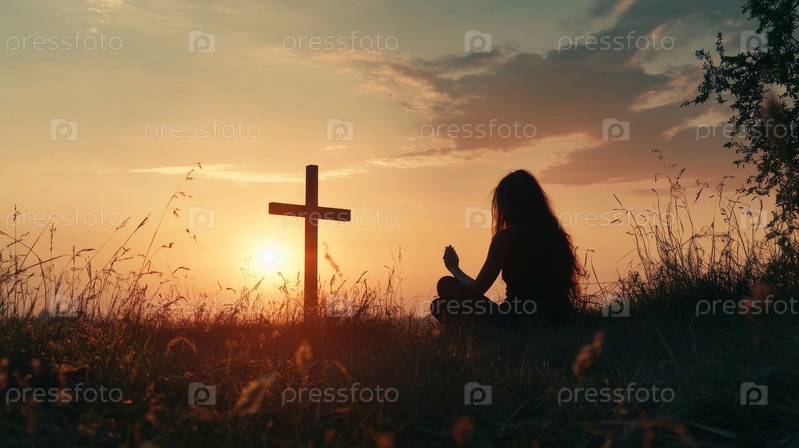 Силуэт женщины, сидящей на траве и молящейся перед крестом на закате
