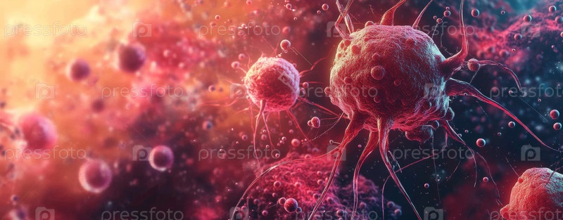 Микроокружающая среда опухоли с раковыми клетками, Т-клетками, наночастицами, молекулами и кровеносными сосудами. Концепция исследования онкологии, копирование пространства