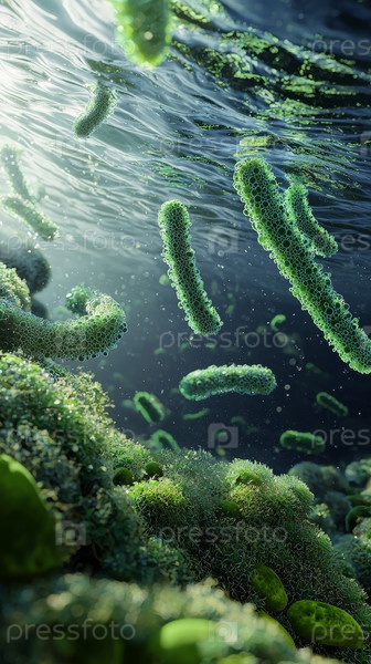 Увлекательная иллюстрация, демонстрирующая широкий спектр разнообразных бактерий, процветающих в оживленной водной среде обитания