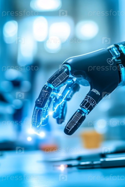Гладкий и продвинутый футуристический протез конечности со встроенными датчиками роботизированная рука легко взаимодействует в современной среде медицинского учреждения