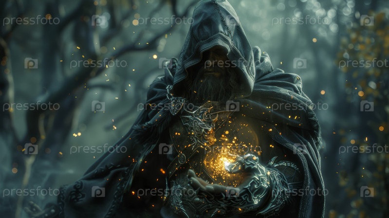 Темный и могущественный колдун создает завораживающую галактику очаровательных звезд в мистическом, эфирном ландшафте