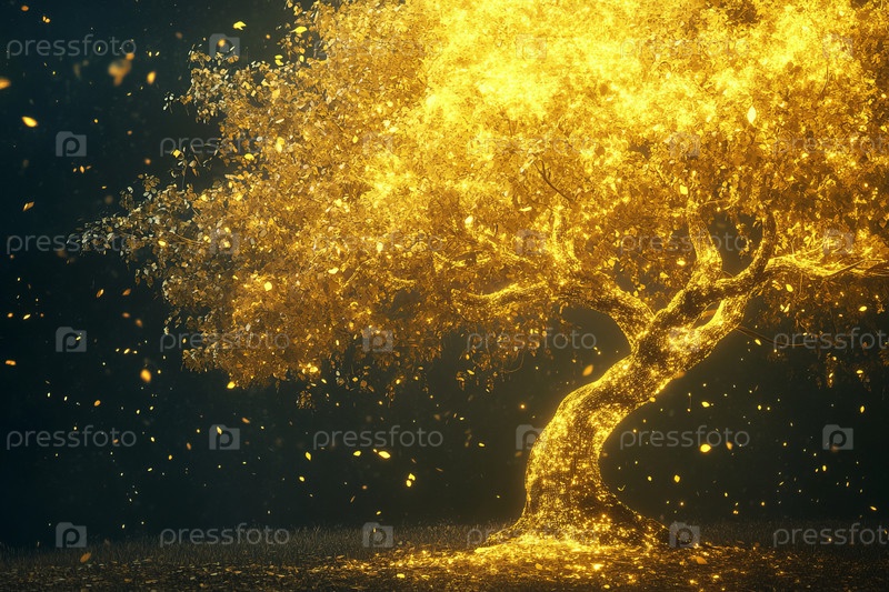 Светящееся и чарующее дерево излучает теплый золотой свет в мистической атмосфере, наполненной сверкающим очарованием