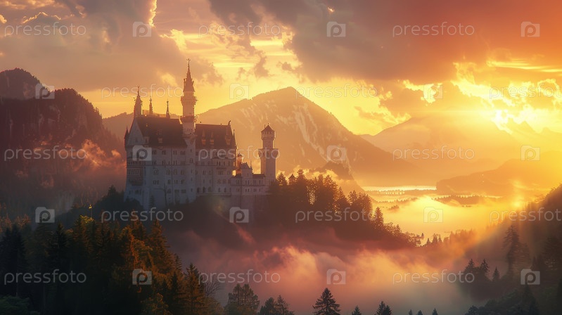 Пастельный цветной замок на закате, фэнтезийный фон, веб-баннер или заголовок