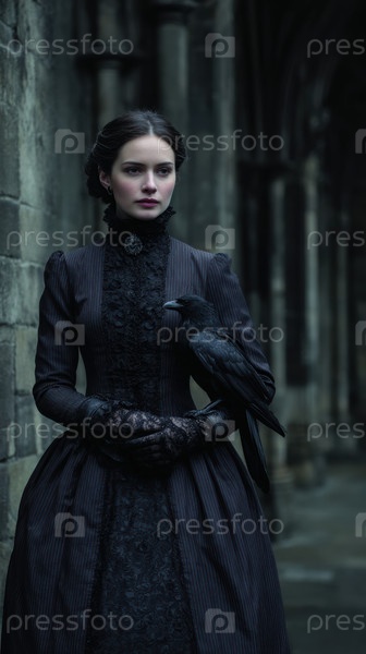 Рыжеволосая женщина в готическом дворе, одетая в черное викторианское траурное платье, кружевные перчатки, сжимая ворона, пока снежные бури оседают на древнем камне