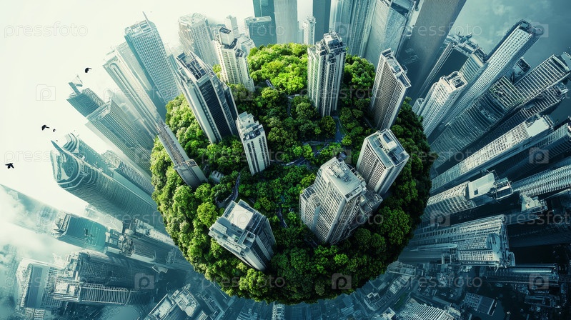 Потрясающий футуристический городской пейзаж с пышным земным шаром рядом с силуэтом разных людей
