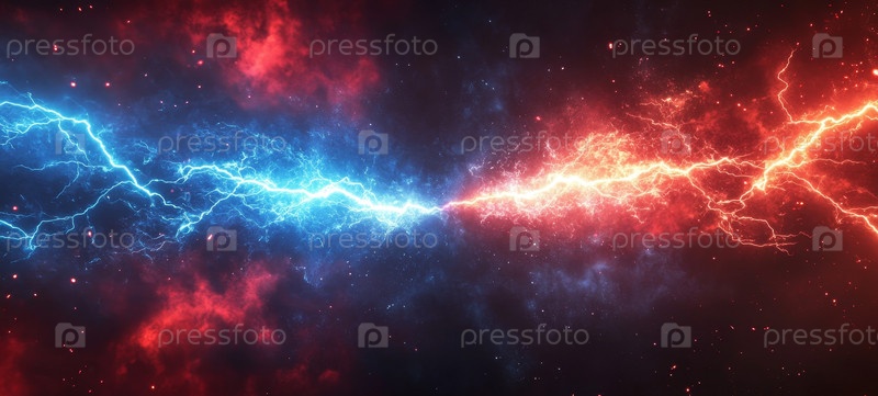 Столкновение космической энергии драматично Сине-красная молния взаимодействует в огромном пространстве
