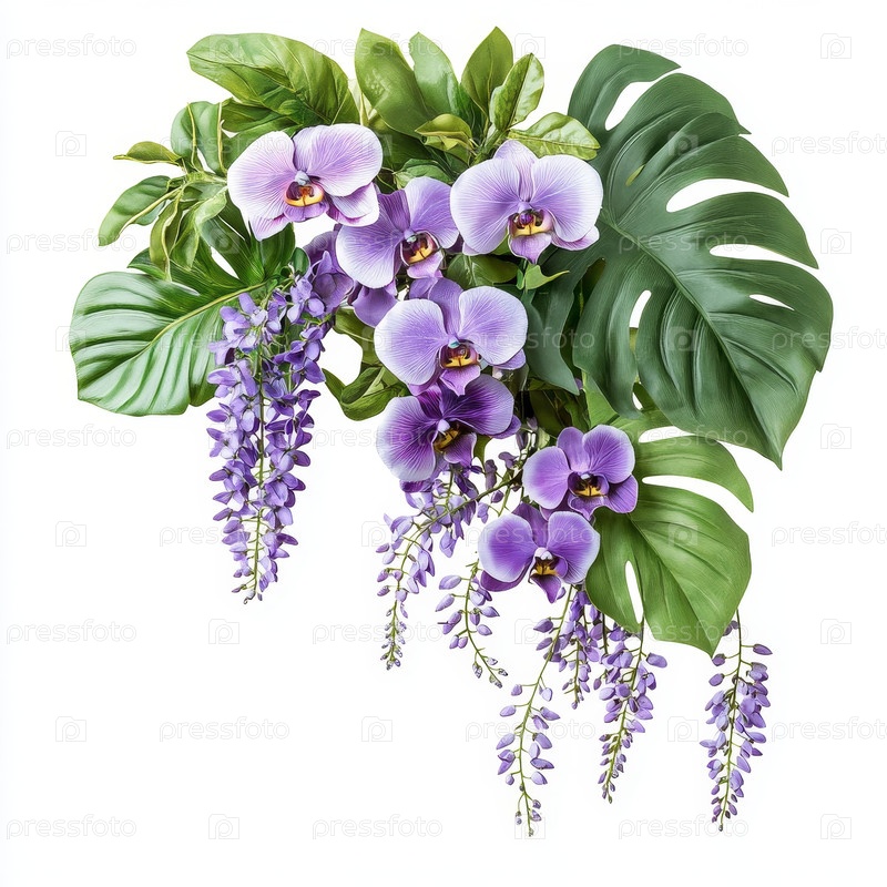 Потрясающая и яркая цветочная композиция с красивыми фиолетовыми орхидеями, дополненными пышными зелеными листьями