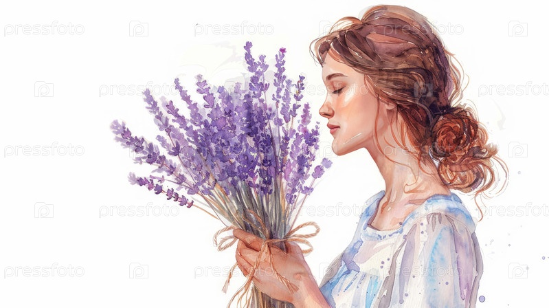 Акварельная иллюстрация, изображающая спокойную женщину в окружении лавандовых цветов с чувством изящества и спокойствия