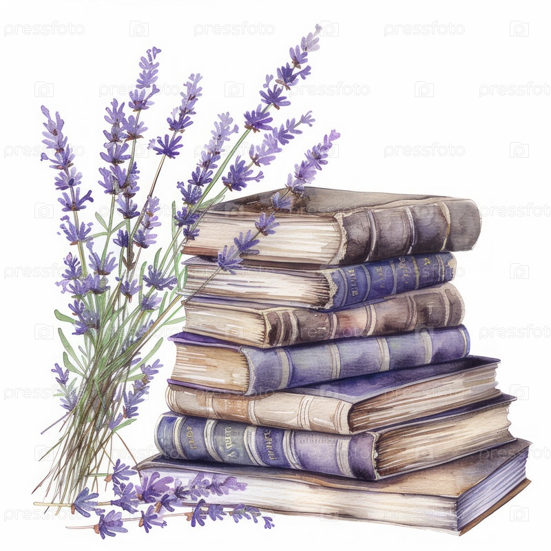 Пачка старинных книг с лавандовыми цветами, идеально подходящая для уютной атмосферы, вдохновляющей на творчество
