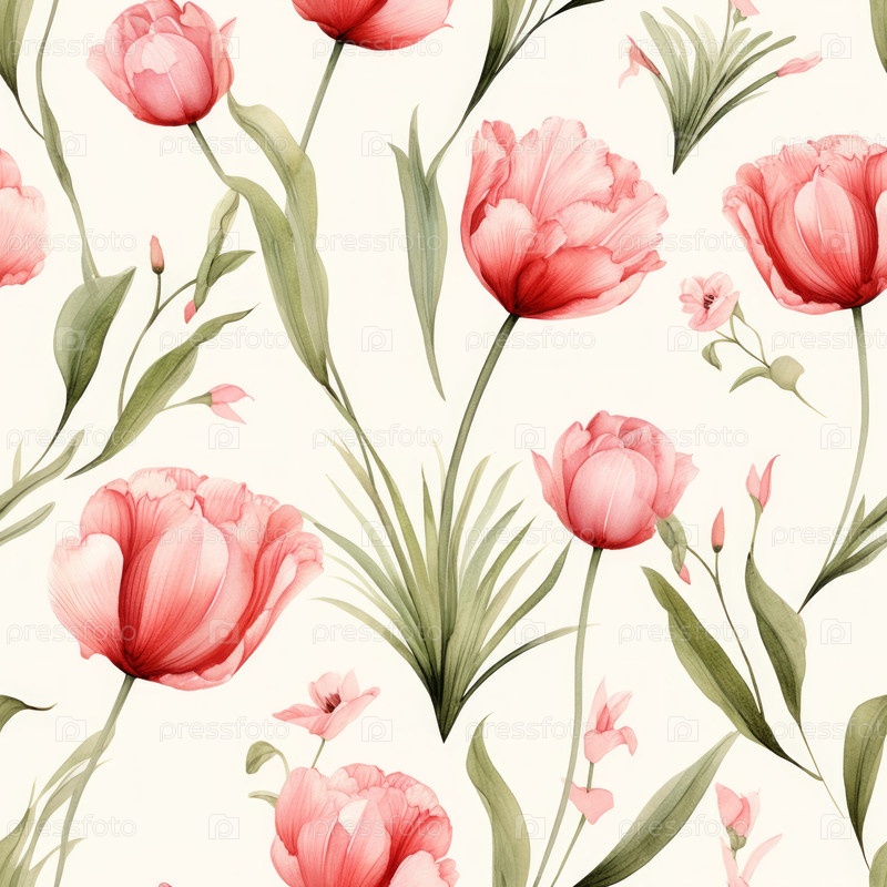 Этот красивый акварельный рисунок демонстрирует яркие розовые и персиковые тюльпаны, установленные на мягком, дополнительном фоне