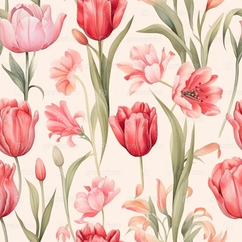 Очаровательный акварельный цветной рисунок с живыми, яркими розовыми и персиковыми тюльпанами рядом с пышной зелени