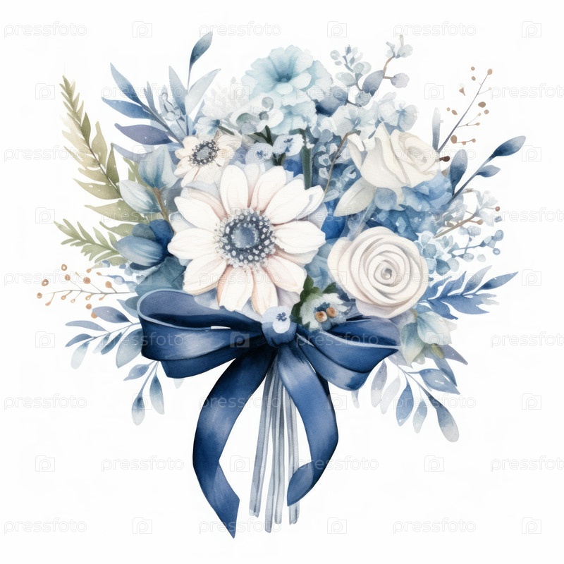 Элегантный сине-белый цветочный букет с лентой, идеально подходящий для свадеб или особых торжеств