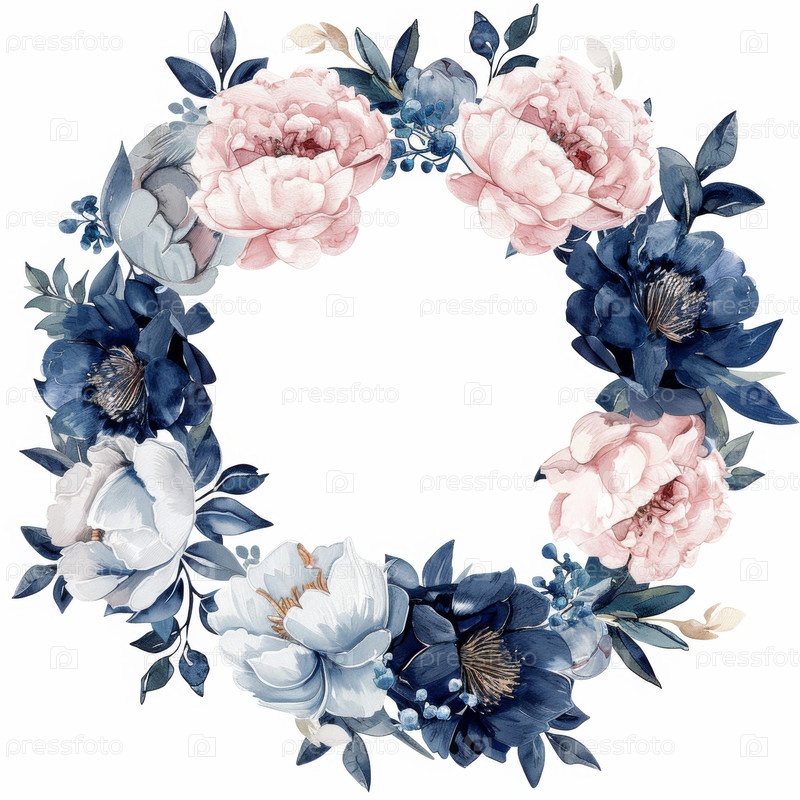 Элегантный цветочный венок, украшенный мягкими пастелями и глубоким блюзом, идеально подходит для различных праздничных дизайнов