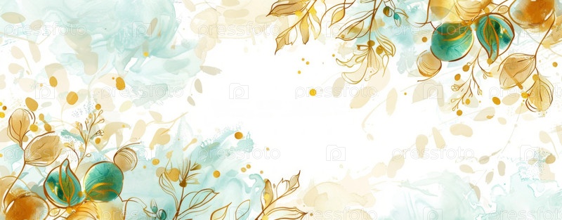 Цветочный фон синие и зеленые акварельные пятна. Золотая вишня оставляет настенное искусство с блестящей светлой текстурой