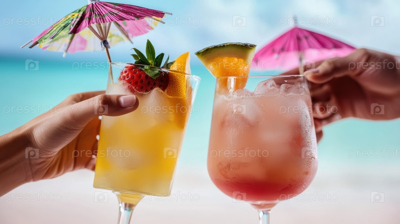 Пара весело тостирует с негабаритными тропическими напитками, украшенными свежими фруктами и крошечным зонтиком