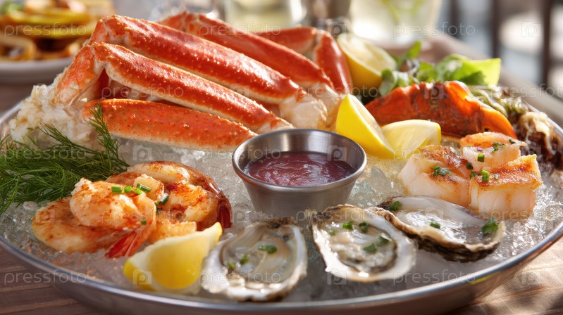Охлажденные блюда из морепродуктов с крабовыми ножками, представленными на ложе измельченного льда с устриками, жареными креветками, каштановыми гребешками, лимонными клиньями и коктейльным соусом