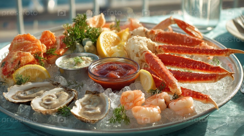 Охлажденные блюда из морепродуктов с крабовыми ножками, представленными на ложе измельченного льда с устриками, жареными креветками, каштановыми гребешками, лимонными клиньями и коктейльным соусом