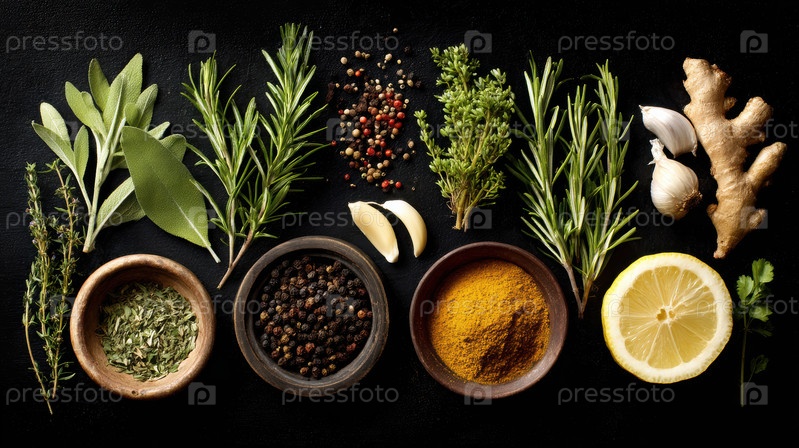 Свежие травы и специи, устроенные на черном фоне с лимонными ломтиками, деревянные ложки, держащие перчинки и порошок чили, гвоздики чеснока, розмарин, базилик, тимьян