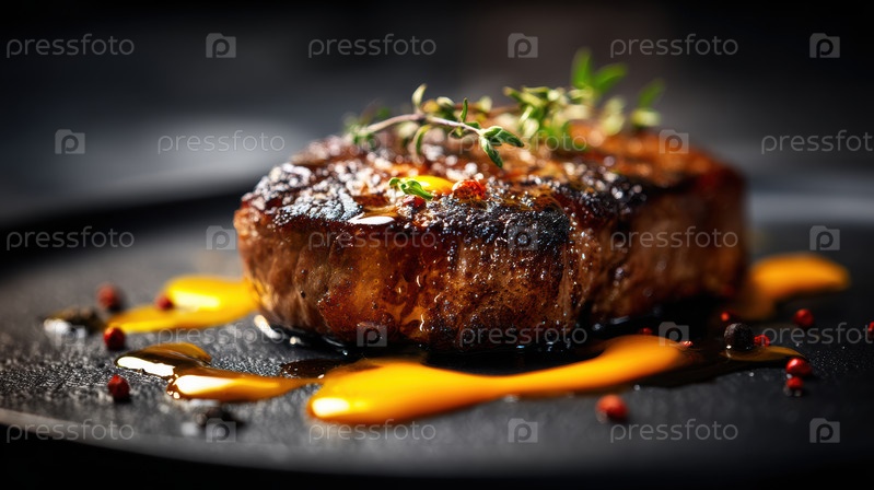 Стейк для гурманов на темной тарелке, зажженный, чтобы подчеркнуть окоченевшую текстуру и яркие соусные дожди