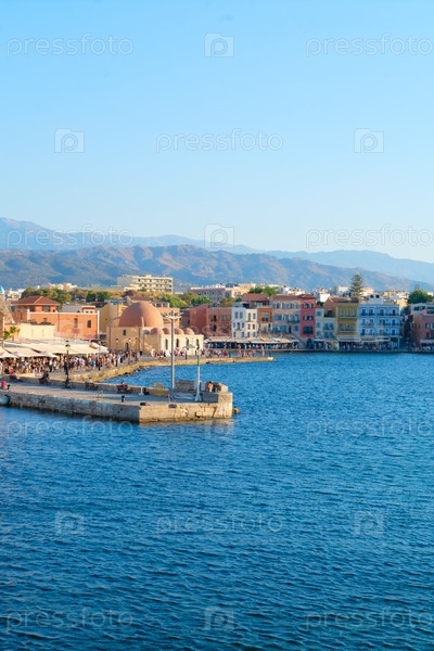 Венецианская гавань Ханья с историческими домами в солнечный день, Крит, Греция