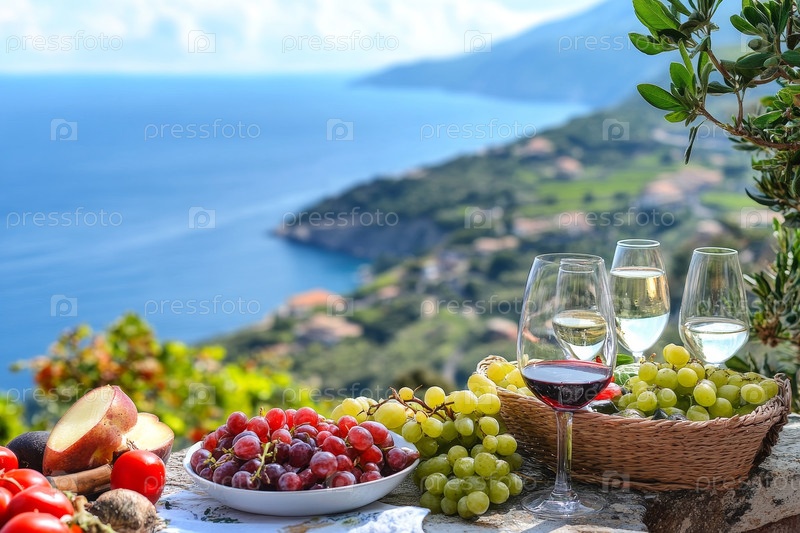 Яркое и разнообразное распространение восхитительных средиземноморских блюд на захватывающем прибрежном фоне